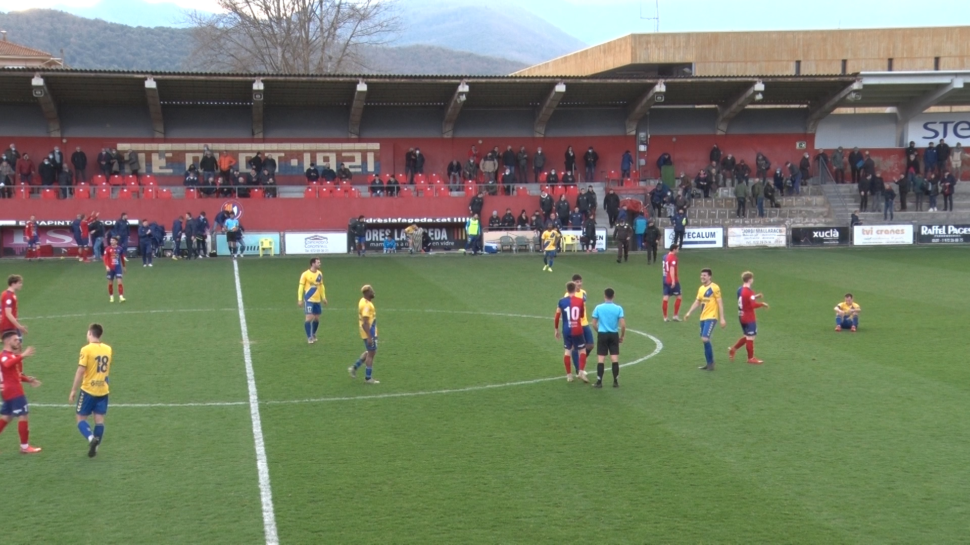 Els darrers classificats han tingut un cop de mala sort a l'inici del partit, ja que Sergio s'ha lesionat en una acció amb Èric Vilanova. Xumetra ha tingut la primera ocasió amb una rematada de cap massa centrada que ha pogut aturar sense dificultats Yan Carlos. En tot cas, la jugada clau del partit ha arribat en un llançament de Ferri que, segons el col·legiat, ha impactat a les mans d'Òscar Ruiz. A la mitja hora de joc, el penal l'ha transformat Arranz amb una molt bona definició que avançava l'Olot en el marcador. Tot i això, una mica més tard també ha arribat una acció que canviaria el matx. La Guineueta ha sortit al contraatac, Abde s'havia quedat sol davant Batalla i Aimar Moratalla ha comès la falta per evitar el gol. Com a últim home, l'àrbitre ha decidit expulsar el lateral dret, i ha obligat Carbó a moure fitxa. Xumetra ha sigut el sacrificat davant l'entrada de Callís al terreny de joc. El mateix Callís ha tingut el segon en una acció que ha aturat molt bé el porter de la Guineueta.