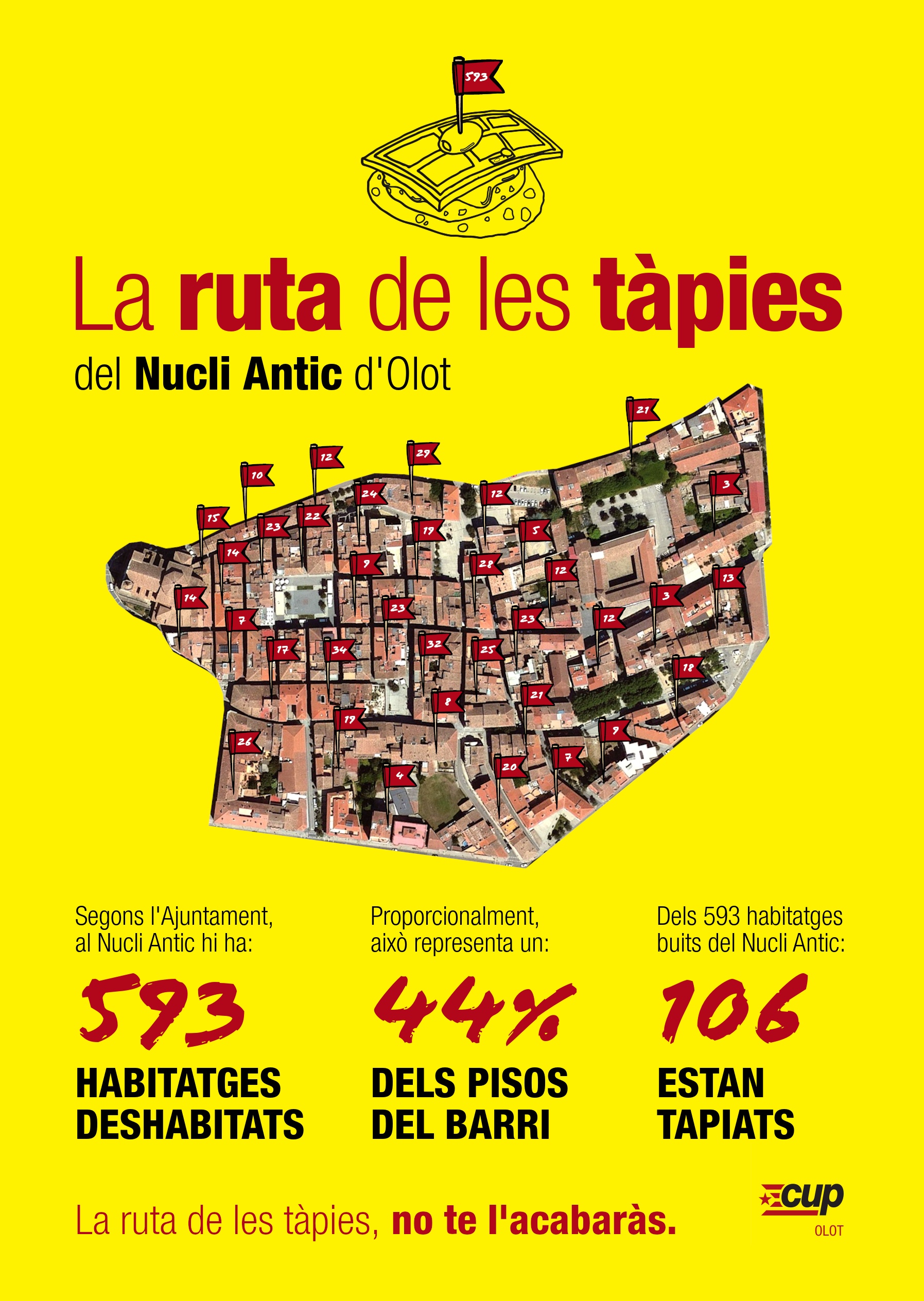 Un total de 593 habitatges buits que representen el 44% del barri del Nucli Antic. La CUP Olot ha iniciat una campanya per denunciar la quantitat d'habitatges buits que hi ha al centre de la ciutat fent una similitud amb la coneguda 'Ruta de les Tapes'. Més d'un centenar d'aquests habitatges, a més, estan tapiats. Gairebé la meitat dels locals del barri estan tancats. Segons el partit, els grans propietaris i els diferents equips de govern dels darrers anys han abandonat el barri. També asseguren que els locals no funcionaran mentre no es resolgui el problema de l'habitatge.