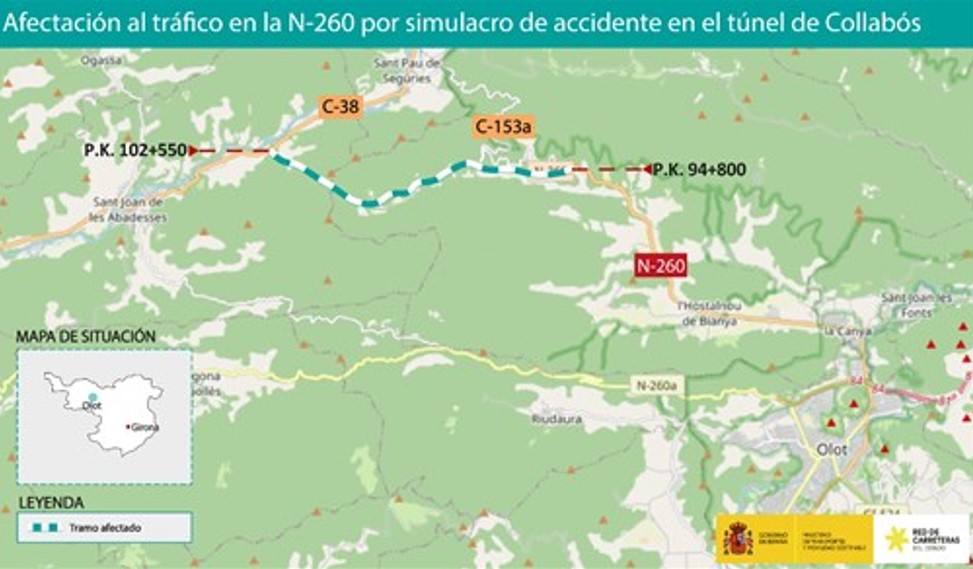 Tall al túnel de Collabós per un simulacre d’accident. Es farà aquest dijous a partir de les 22.30h fins les 4 de la matinada. Es tracta d’una acció a càrrec del Ministeri de Transports i Mobilitat Sostenible on es simularà un accident de trànsit dins el túnel i un posterior incendi. Les vies alternatives seran la carretera de Sant Salvador de Bianya pels vehicles que vinguin des d’Olot. Per l’altra banda, el trànsit es desviarà per la carretera C-38 de Sant Pau de Segúries.
