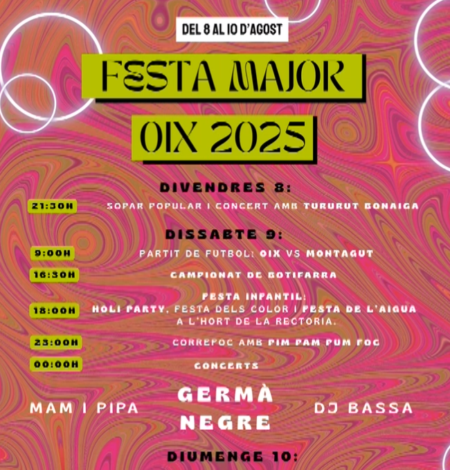 Aquest 8 d’agost s’inaugura amb un sopar popular amenitzat per Tururut Bonaiga la Festa Major d’Oix. El dissabte seguirà amb un partit de futbol contra Montagut, tal com diu el membre de la Mainada, Pau Abel: “El partit de futbol fa molts anys que el fem. Primer va començar amb el partit de solters contra casats, després amb el de poble contra càmping i aquest any per la Festa Major de Montagut es va fer un triangular amb la Cometa inclosa. Llavors, vàrem guanyar a la Cometa, però es va perdre contra Montagut. Per tant, per la Festa Major d’Oix s’haurà de fer la revenja.”