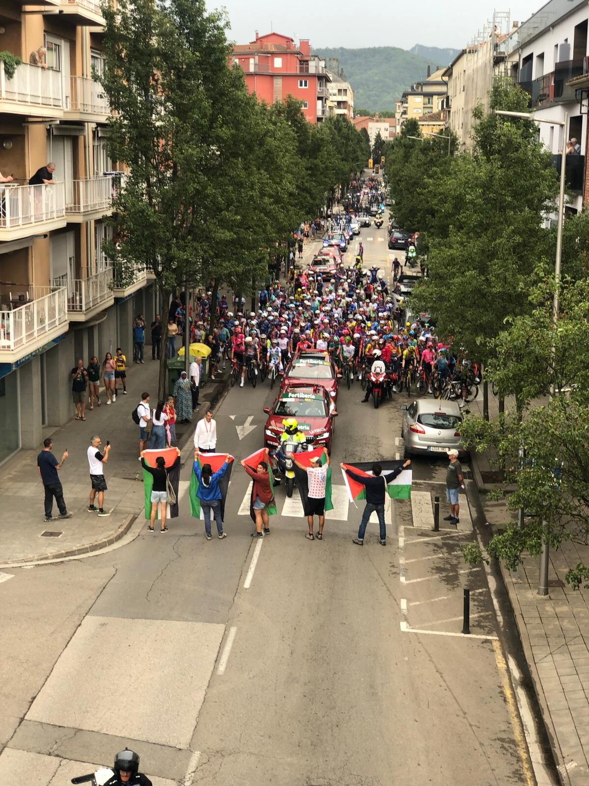 Diverses persones han aturat l’etapa just a sota el pont de la Ceràmica protestant en contra de la participació de l’equip d’Israel
