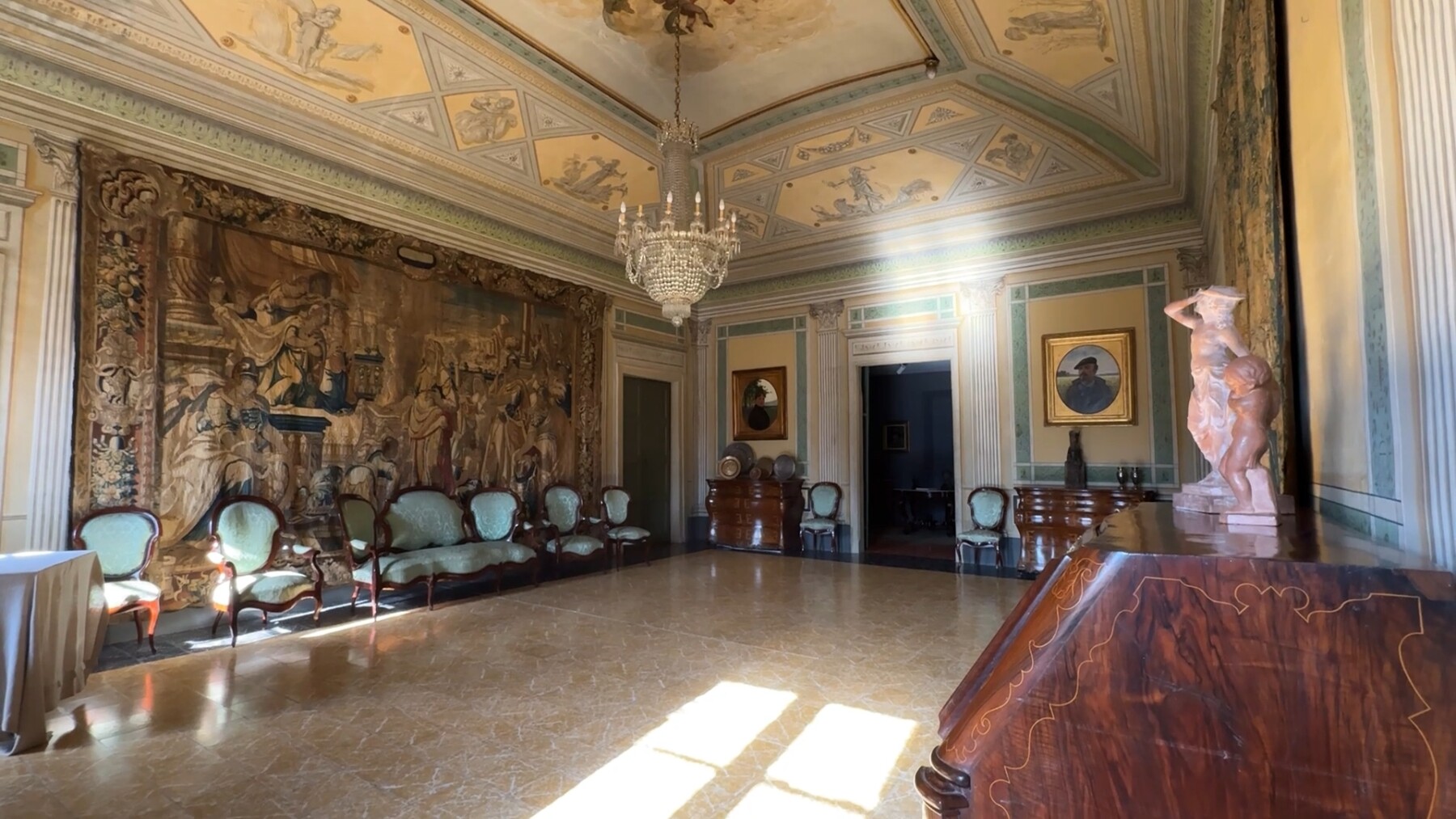 Sostres alts, mobles originals, retrats familiars que et miren des de les parets. Tant de pes històric fa que a cada passa vagis amb compte. Els salons gegants amb tapissos i pintures a les parets i al sostre, el despatx i la biblioteca, amb prestatgeries plenes de llibres vells i aquella sensació que allà s’hi ha llegit i pensat molt. Cada sala té més pes que l’anterior i impressiona encara més.